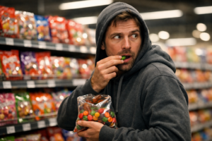 Dans le magasin dont vous êtes l'agent pré-vol, vous apercevez une personne consommant des bonbons et des boissons dans le magasin. Une fois terminée sa consommation, et les emballages jetés, cette personne continue ses courses normalement :